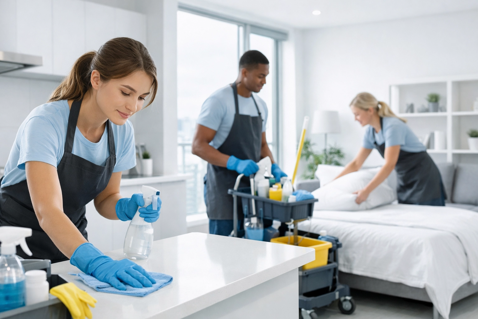Start with the basics: dust, vacuum, sweep: then work through detail items. High-traffic areas need extra attention. Make this checklist standard across all units and all crews.