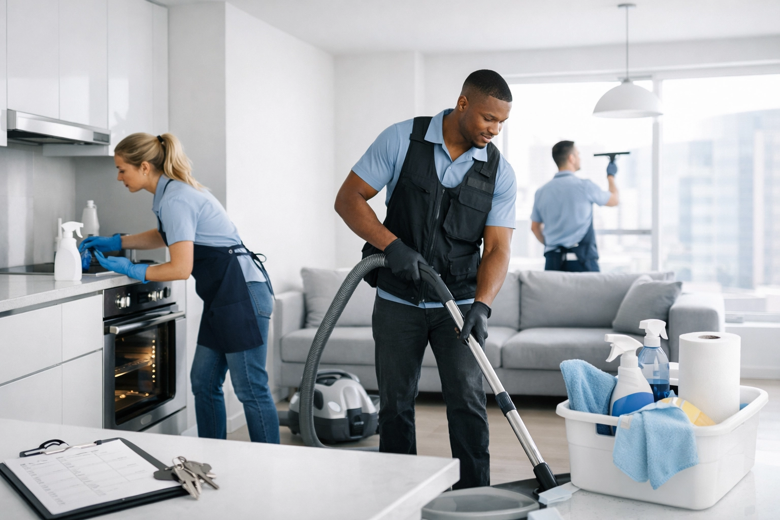 Professional cleaning crew reviewing apartment turnover checklist with supplies