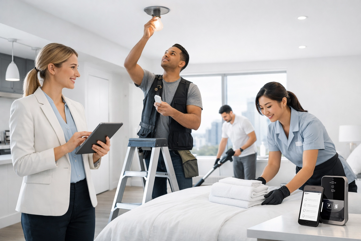 Deep clean first (Days 1-2): Professional make-ready cleaning happens before repairs. It's easier to spot damage on clean surfaces, and contractors work faster in clean spaces.