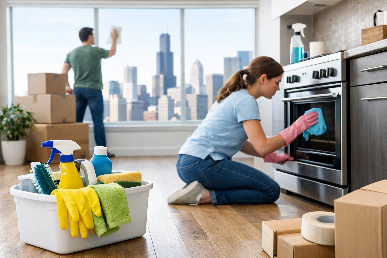 Image Prompt: A high-angle, professional photograph of a modern, empty high-rise apartment living room in Chicago with floor-to-ceiling windows showing the city skyline. The hardwood floors are gleaming, and the space is pristine, emphasizing a successful professional turnover. No people or text in the image.