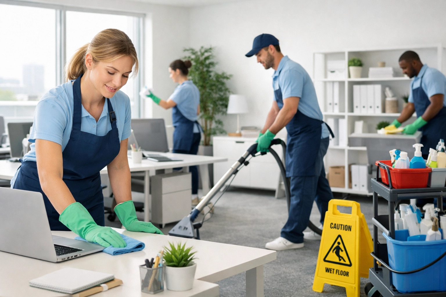 Professional janitorial cleaning cart and equipment in a bright, modern office corridor.