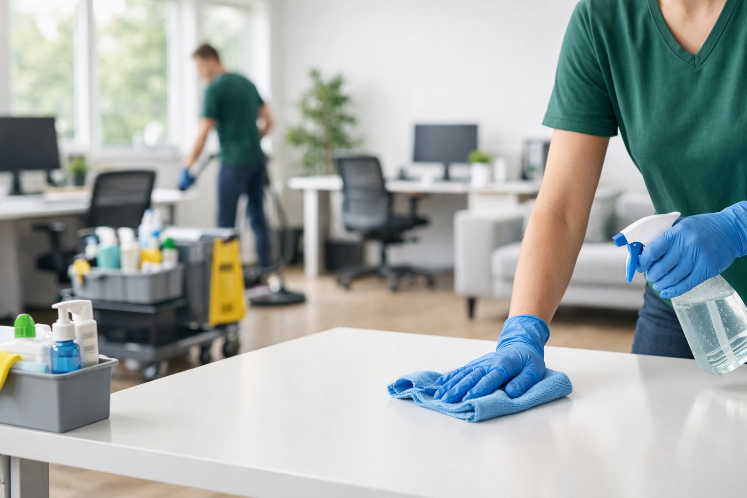 - High-Touch Disinfection: Sanitizing door handles, elevator buttons, light switches, and reception counters.