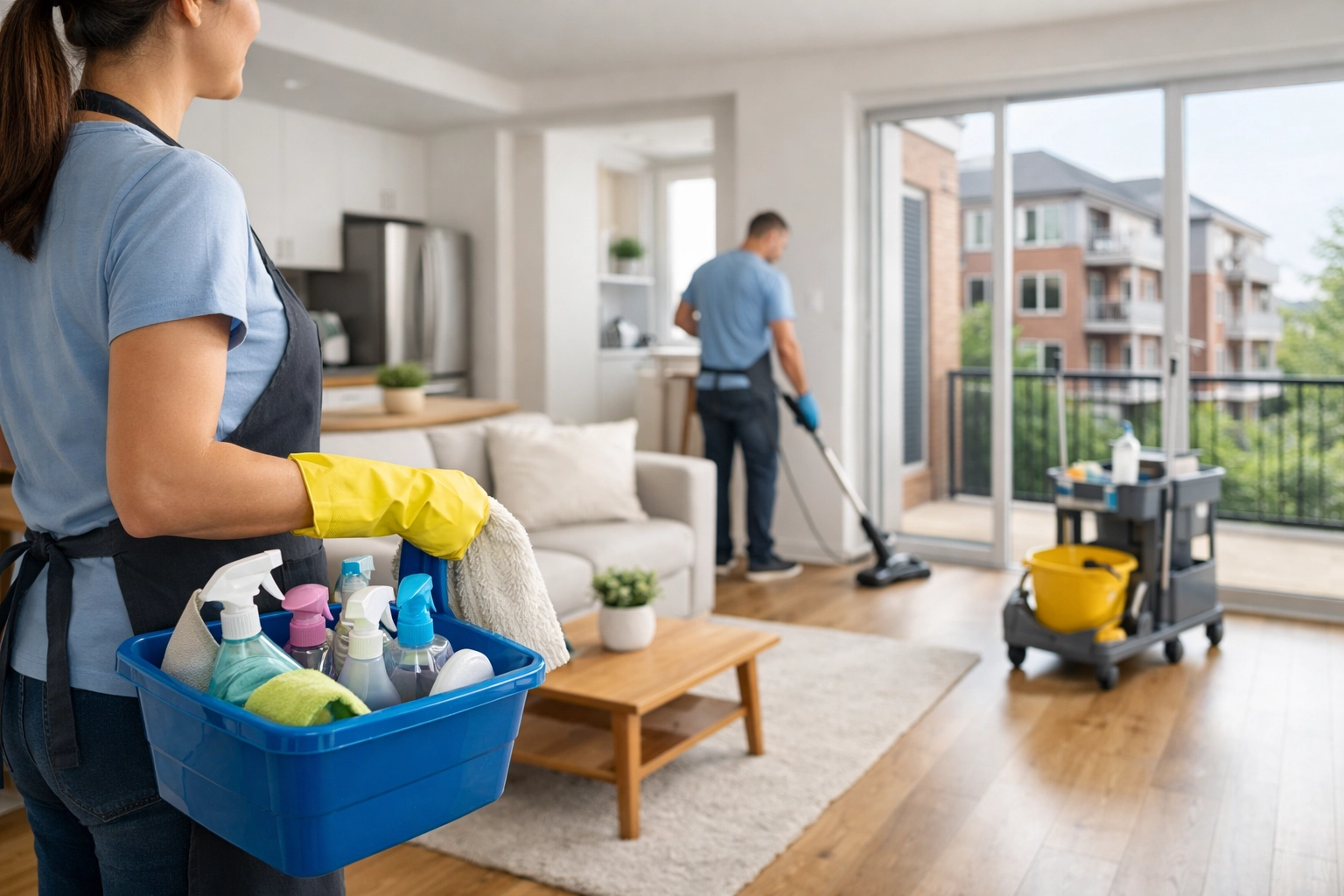 Image Prompt: A professional-grade cleaning cart standing in a high-end modern apartment building lobby in a major Midwest city like Chicago, with large windows showing a city skyline. No text on image.