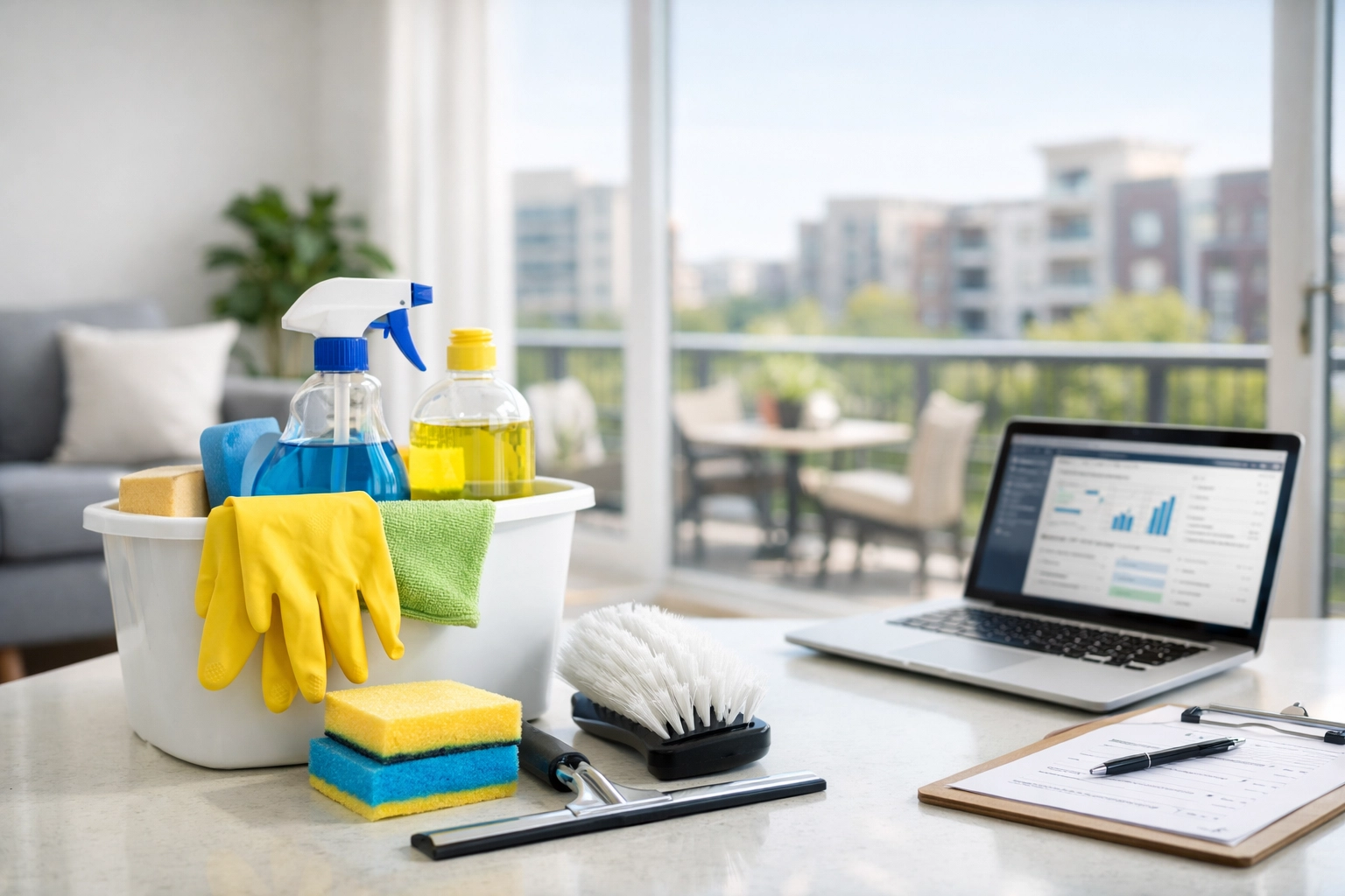 Image Prompt: A professional, high-angle shot of a clean, modern apartment interior in a city like Chicago, with floor-to-ceiling windows showing a skyline, a neat cleaning caddy resting on a marble countertop. No text, no faces.