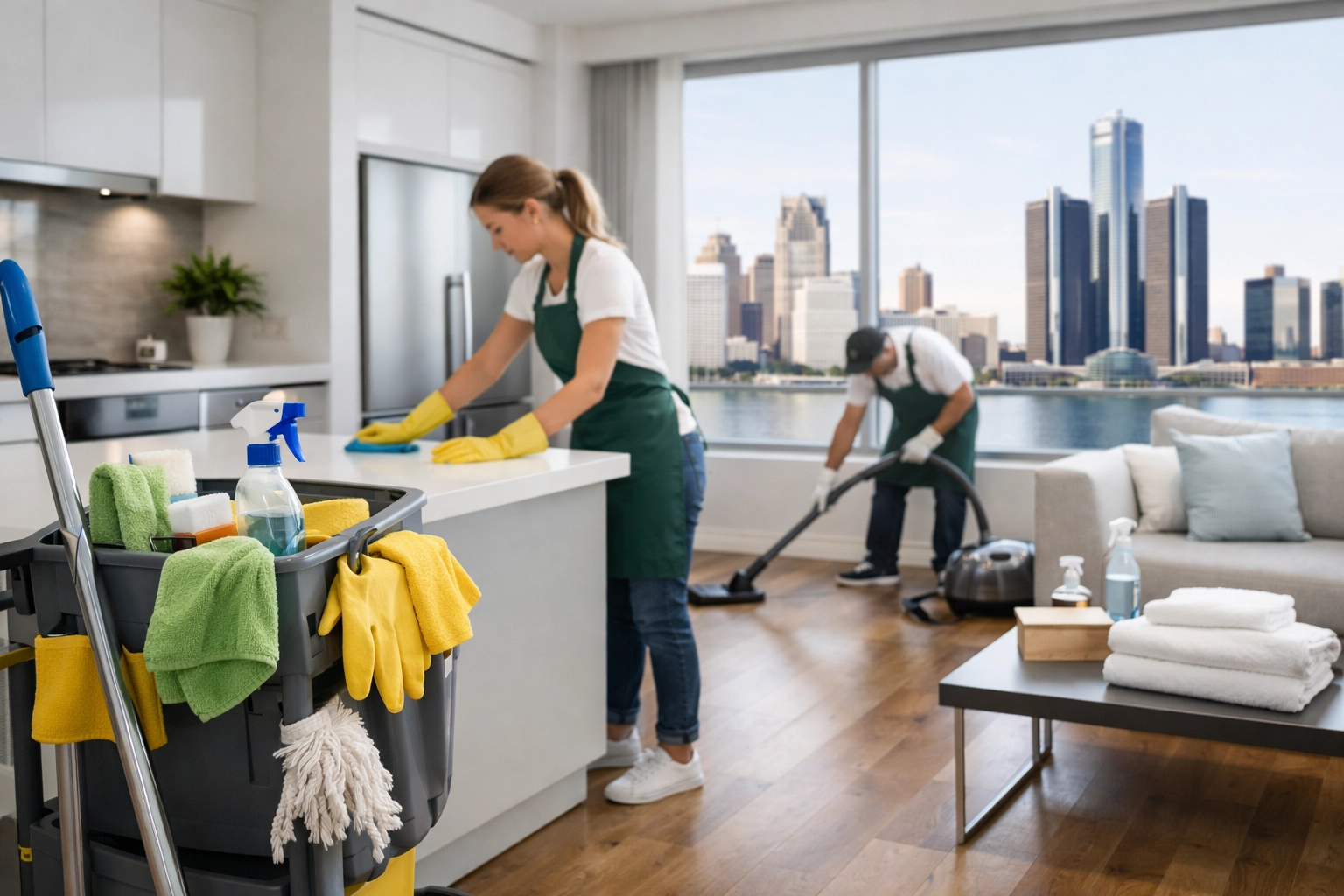 A high-end, sunlit vacant apartment in downtown Detroit with polished wood floors and a sparkling kitchen. Through the window, the Detroit city skyline is visible. On the kitchen counter sits a professional cleaning checklist and a set of keys. High-authority, professional photography style, no text on image.