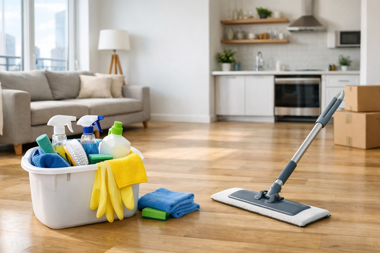 Image Prompt: A high-angle, professional shot of a modern apartment interior in Chicago, featuring floor-to-ceiling windows with a city skyline view, highlighting a spotless, sunlight-reflecting hardwood floor and clean surfaces.