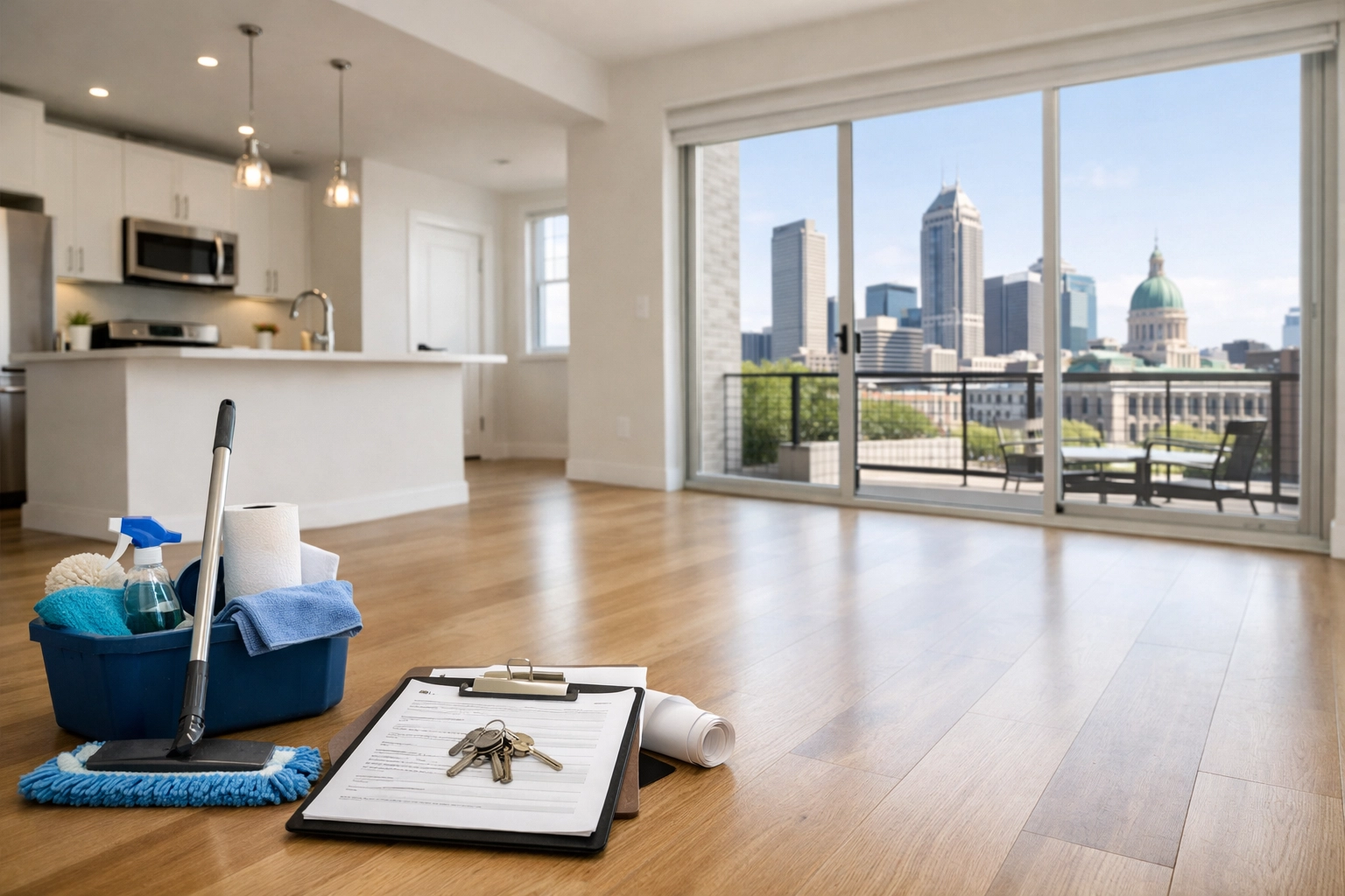 A bright, modern apartment interior in Indianapolis with large windows showing a hint of the city skyline, professionally cleaned and ready for a new tenant. High resolution, professional architectural photography, no people, no text.