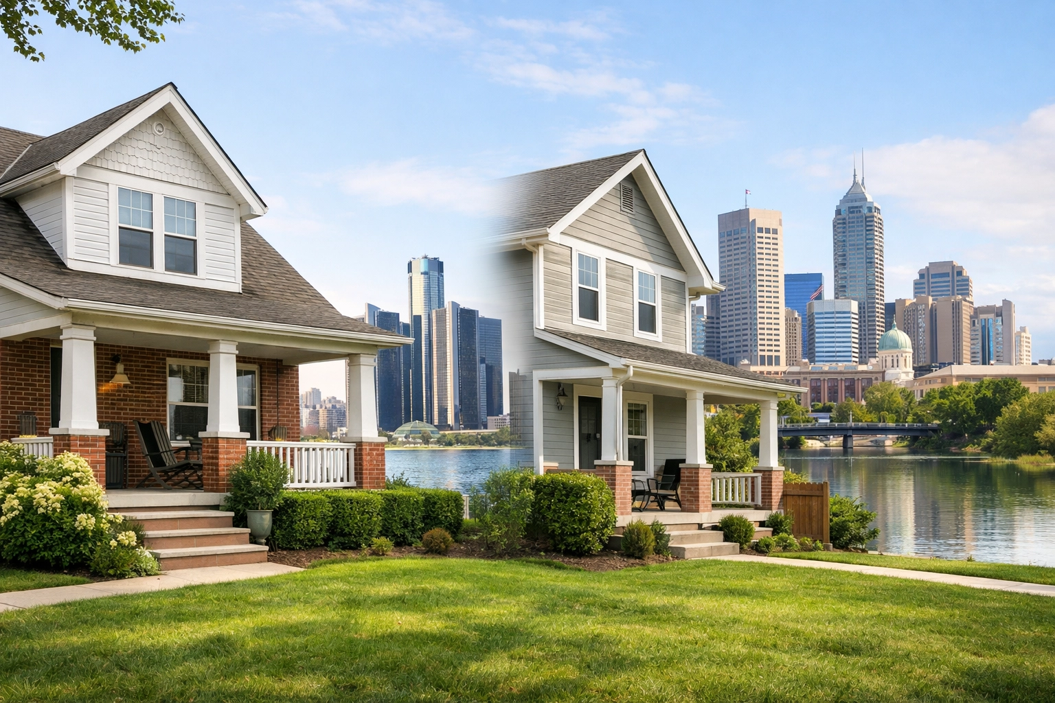 Image Prompt: A professional, wide-angle shot of a clean, modern apartment interior in a city like Indianapolis or Detroit, with large windows overlooking a metropolitan skyline. No text, no faces. Focus on pristine surfaces, polished floors, and bright natural light.