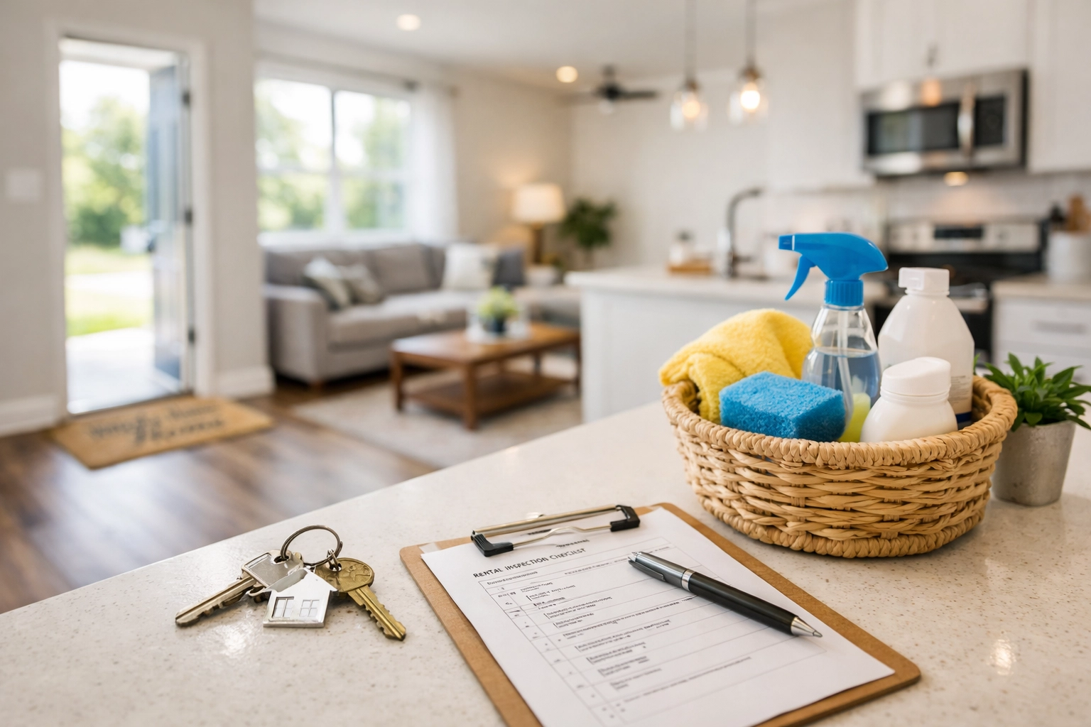 Image Prompt: A professional, organized maintenance "turnover kit" sitting on a granite countertop, featuring branded lightbulbs, air filters, and a set of new keys. Simple, clean, and professional. No text.