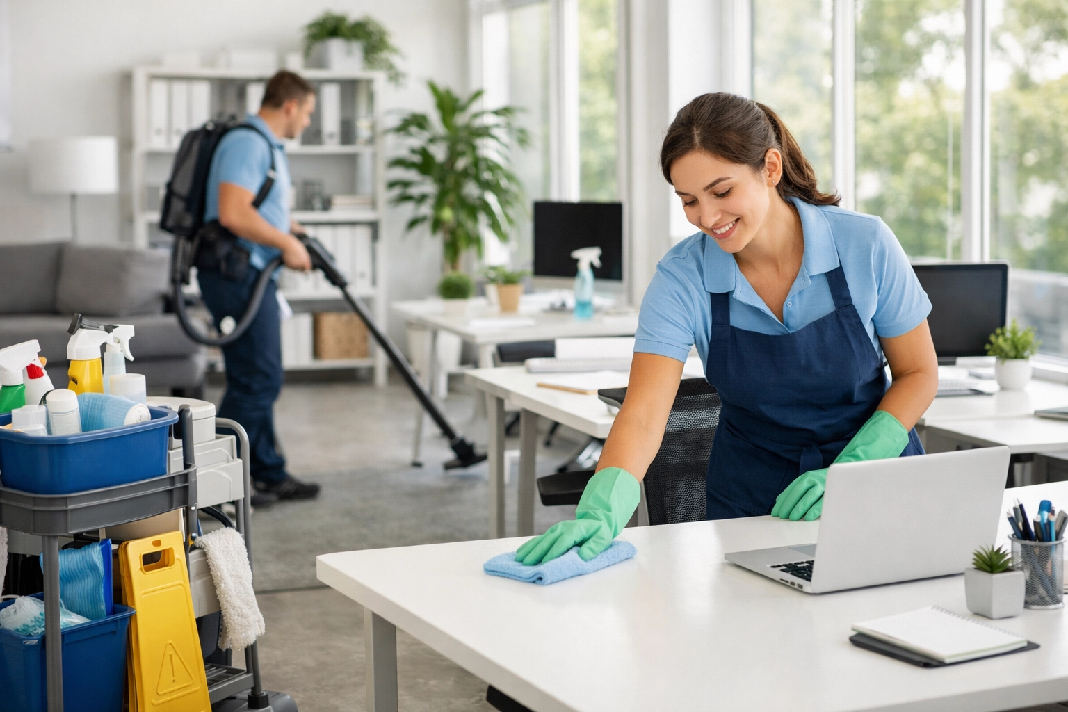 - Glass & Surfaces: Wiping down interior glass partitions, mirrors, and desk surfaces.