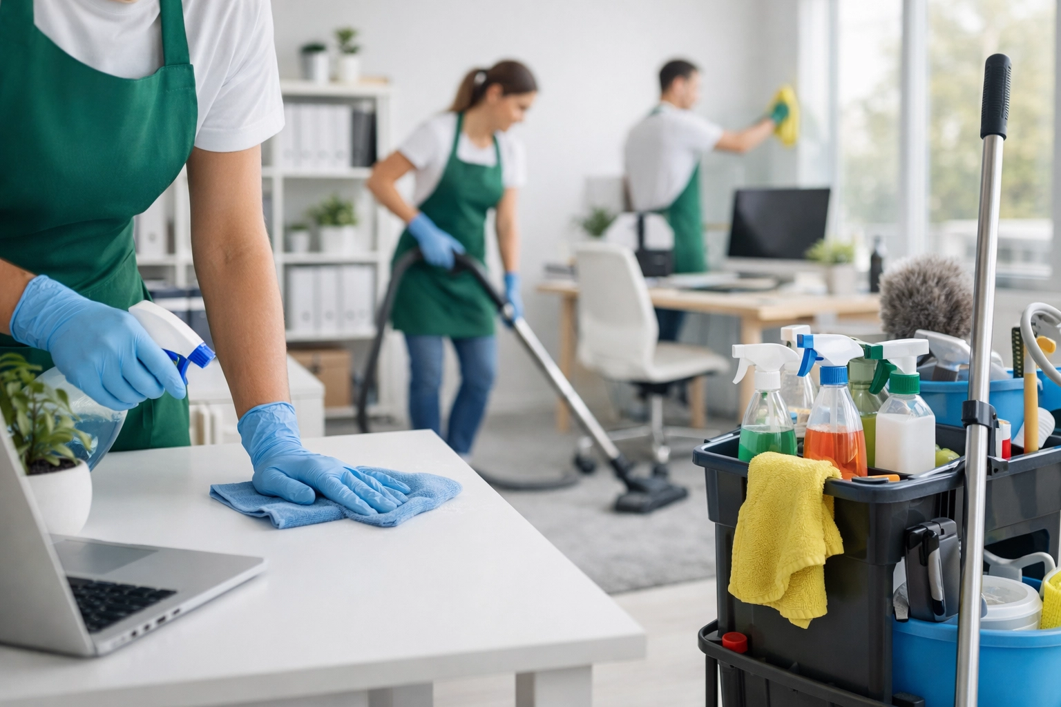 Image Prompt: A close-up of a professional cleaning cart with various supplies, positioned in a brightly lit, modern office hallway with glass office partitions.